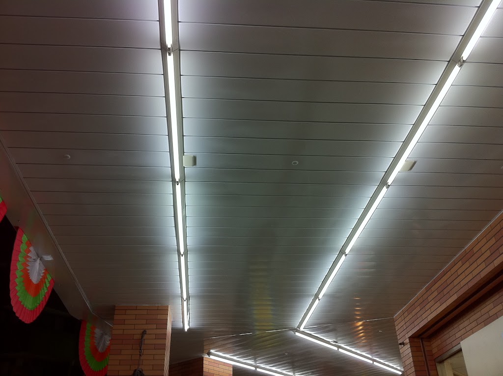 騎樓燈終於減量設計了,這些新店面的規劃都採用兩排T5燈具,一樣達到不錯的照明效果,同時以白色鋁板做天花裝修達到更高的明度